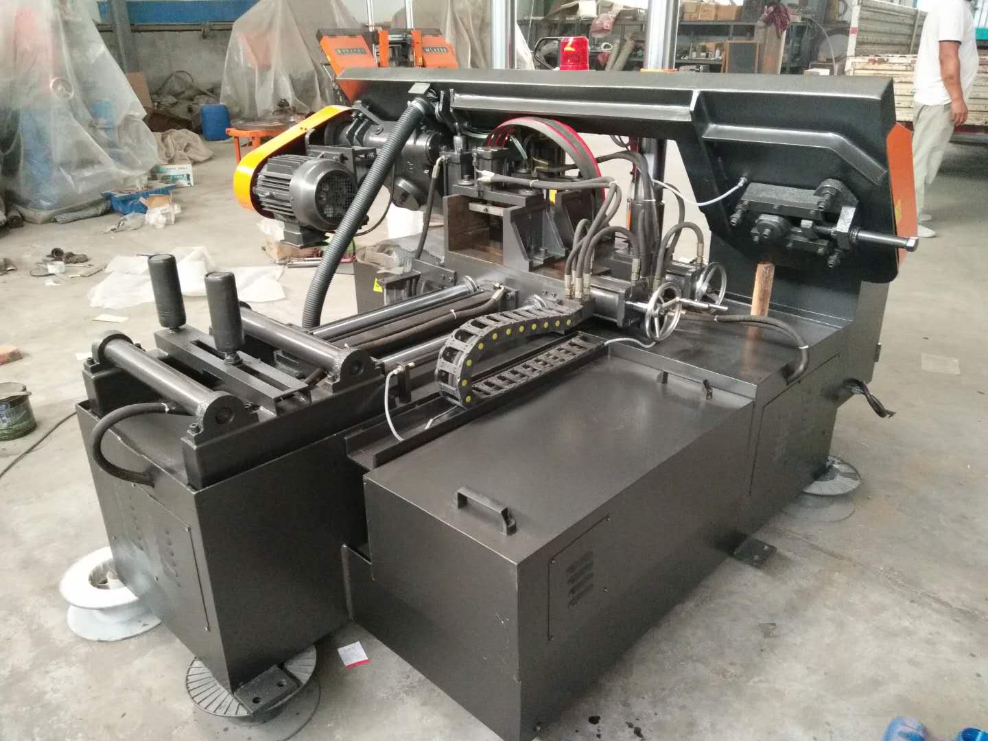 金屬帶鋸床適應(yīng)性廣、動(dòng)力耗費(fèi)低、操作簡潔、易于保護(hù)并可進(jìn)行視點(diǎn)切開,所以獲得了越來越廣泛的使用。在金屬帶鋸床中又以雙立柱金屬帶鋸床功能最優(yōu)。雙立柱帶金屬帶鋸床采用雙導(dǎo)向柱雙液壓缸整體鋸架構(gòu)造,運(yùn)用平行法鋸削,剛度持久,保證鋸架作業(yè)的穩(wěn)定,延長金屬帶鋸床的使用壽命。